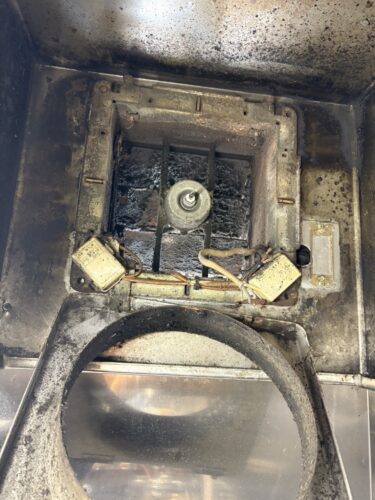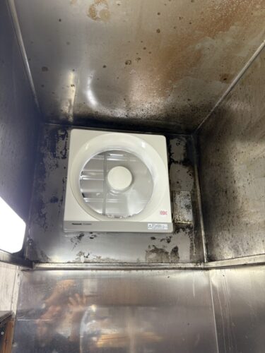 油汚れと劣化が進んだ既存換気扇を撤去し、新品の換気扇へ交換しました。あわせて配線や接続部の点検を行い、厨房環境に適した電気工事を実施しています。